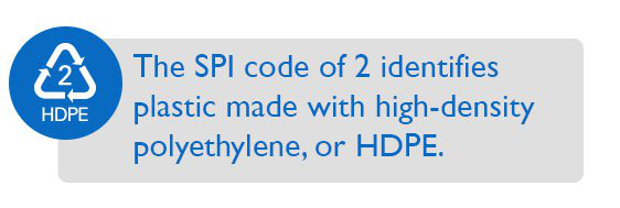 एसपीआई कोड 2 उच्च घनत्व वाले पॉलीथीन, या एचडीपीई के साथ बने प्लास्टिक की पहचान करता है। एचडीपीई उत्पाद बहुत सुरक्षित हैं और खाद्य पदार्थों या पेय पदार्थों में किसी भी रसायन को छिड़कने के लिए जाने जाते हैं। (हालांकि, पहले से आयोजित पदार्थों से प्रदूषण के जोखिम के कारण, कृपया ध्यान दें: एचडीपीई बोतल को भोजन या पेय कंटेनर के रूप में पुन: उपयोग करने के लिए कभी भी सुरक्षित नहीं है अगर इसमें मूल रूप से भोजन या पेय नहीं होता है!) एचडीपीई उत्पादों को आमतौर पर पुनर्नवीनीकरण किया जाता है। इस प्लास्टिक से बने सामानों में दूध, मोटर तेल, शैम्पू और कंडीशनर, साबुन की बोतलें, डिटर्जेंट और ब्लीच के लिए कंटेनर शामिल हैं। कई व्यक्तिगत खिलौने भी इस प्लास्टिक से बने होते हैं। पुनर्नवीनीकरण एचडीपीई प्लास्टिक के टुकड़े, प्लास्टिक की लकड़ी, बाड़ लगाने, और अधिक बनाने के लिए प्रयोग किया जाता है।
