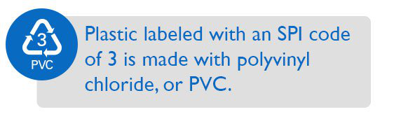3 के एसपीआई कोड के साथ लेबल किया गया प्लास्टिक पॉलीविनाइल क्लोराइड, या पीवीसी के साथ बनाया जाता है। पीवीसी अक्सर पुनर्नवीनीकरण नहीं किया जाता है और अगर निगलना होता है तो हानिकारक हो सकता है। पीवीसी का उपयोग सभी प्रकार के पाइप और टाइल्स के लिए किया जाता है, लेकिन यह आमतौर पर पाइपलाइन पाइप में पाया जाता है। इस प्रकार की प्लास्टिक खाद्य पदार्थों के संपर्क में नहीं आनी चाहिए। पुनर्नवीनीकरण पीवीसी का उपयोग फर्श, मोबाइल होम स्कर्टिंग और अन्य औद्योगिक ग्रेड वस्तुओं को बनाने के लिए किया जाता है।