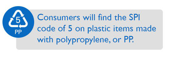 उपभोक्ताओं को पॉलीप्रोपाइलीन या पीपी से बने प्लास्टिक के सामानों पर 5 का एसपीआई कोड मिलेगा। पीपी को पुनर्नवीनीकरण किया जा सकता है लेकिन पीईटीई या एचडीपीई के रूप में रीसाइक्लिंग के लिए स्वीकार नहीं किया जाता है। इस प्रकार का प्लास्टिक मजबूत है और आमतौर पर उच्च तापमान का सामना कर सकता है। कई अन्य उत्पादों में, इसका उपयोग प्लास्टिक डायपर, टुपपरवेयर, मार्जरीन कंटेनर, दही बक्से, सिरप की बोतलें, पर्चे की बोतलें, और कुछ स्टेडियम कप बनाने के लिए किया जाता है । प्लास्टिक की बोतल कैप्स अक्सर पीपी से भी बनाई जाती हैं। पुनर्नवीनीकरण पीपी बर्फ स्क्रैपर्स, रेक, बैटरी केबल्स, और इसी तरह की वस्तुओं को बनाने के लिए उपयोग किया जाता है जिन्हें टिकाऊ होने की आवश्यकता होती है।
