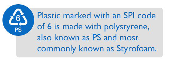 6 के एसपीआई कोड के साथ चिह्नित प्लास्टिक को पॉलीस्टीरिन के साथ बनाया जाता है, जिसे पीएस भी कहा जाता है और जिसे आमतौर पर स्टायरोफोम के नाम से जाना जाता है। पीएस पुनर्नवीनीकरण किया जा सकता है, लेकिन कुशलता से नहीं; रीसाइक्लिंग में बहुत सारी ऊर्जा होती है, जिसका अर्थ है कि कुछ जगहें इसे स्वीकार करती हैं। डिस्पोजेबल कॉफी कप , प्लास्टिक के खाद्य बक्से, प्लास्टिक कटलरी, पैकिंग फोम, और पैकिंग मूंगफली पीएस से बने होते हैं। पुनर्नवीनीकरण पीएस का उपयोग इन्सुलेशन, लाइसेंस प्लेट फ्रेम और शासकों सहित कई अलग-अलग प्रकार के उत्पादों को बनाने के लिए किया जाता है।